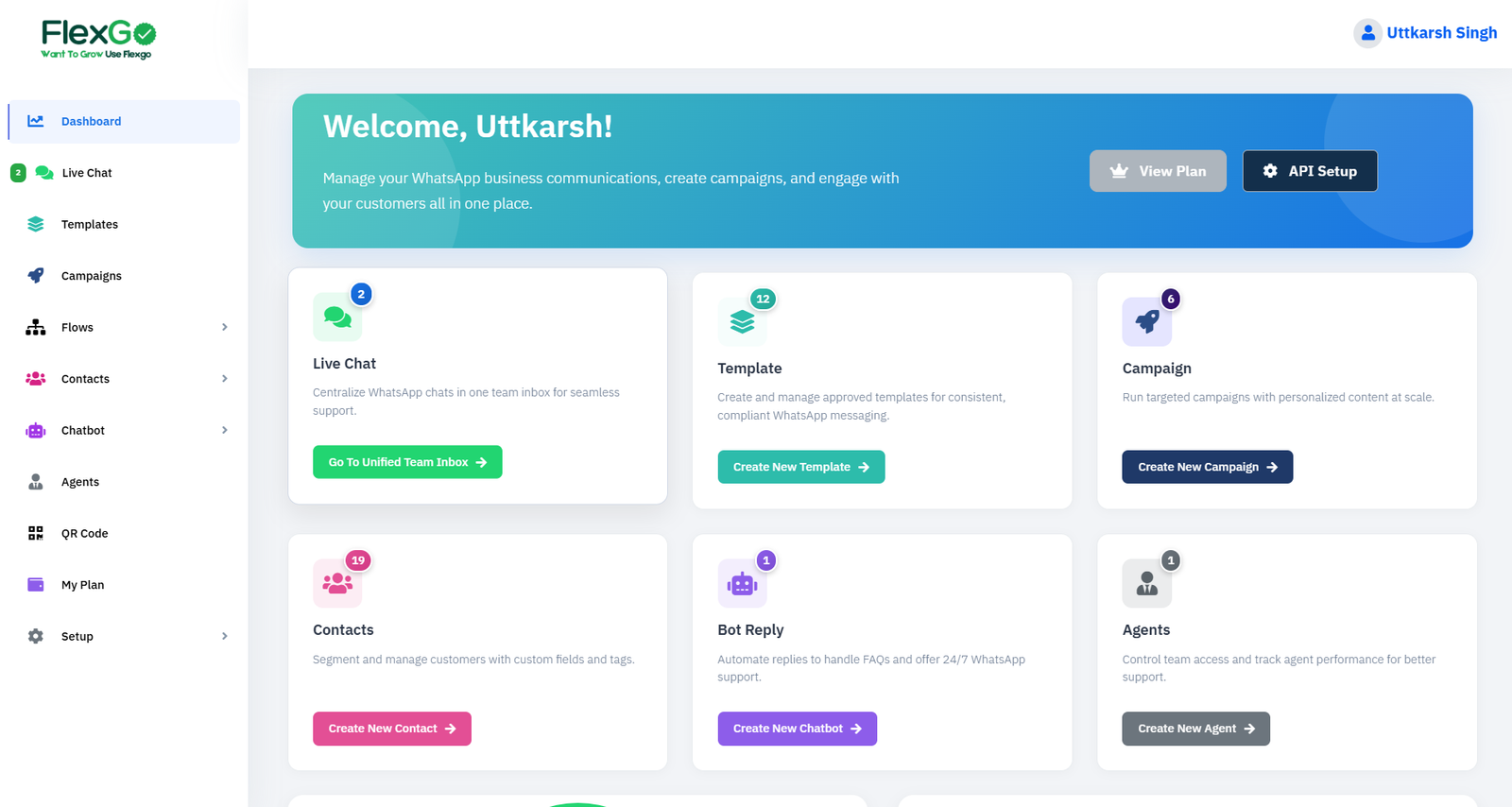 Easily manage all your WhatsApp communications from a single, user-friendly dashboard—powered by Flexgo. Create campaigns, automate chats, manage contacts, and monitor agent performance—everything you need to scale your business messaging is just a click away.